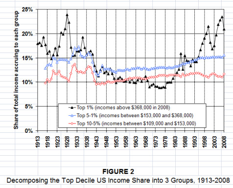 Wie der Grafik zu entnehmen ist, hat sich der Anteil des einkommensstärksten Prozents der Amerikaner am Einkommenskuchen zwischen 1988 und 2008 von etwa 12 auf 21 Prozent fast verdoppelt. Die nächsten, etwas weniger wohlhabenden Gruppen müssen sich mit einem in etwa konstant gebliebenen Stück begnügen. Sie haben zwar am allgemeinen Einkommenszuwachs partizipiert, aber darüber hinaus haben ihnen dreißig Jahre Neoliberalismus nix gebracht. Und sogar das reichste Prozent der US-Amerikaner muss ein Gefühl von Ungerechtigkeit haben, denn das reichste Promille hat wiederum ungleich besser abgeschnitten.